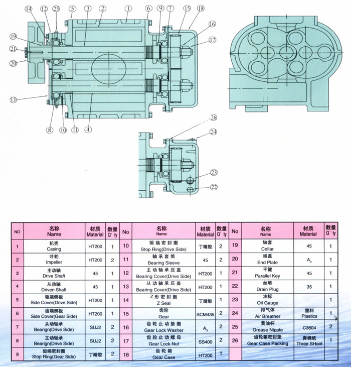 三叶罗茨鼓风机在工作过程中,由于气体回流压缩,会产生很强的空气冲击动力噪音,为了减少这种噪音,在不改变整体有效体积的情况下,减少单个有效体积V的体积,从而达到减少朗姆酒共振效果,降低噪音的目的。将二叶型改为三叶型,有效体积由二等分变为三等分,减少输出气流压力脉动,排气腔部分体积通过叶轮间隙回流到吸入钢的气体流量减少,气体扰动减少,气体脉动压力减少,风机振动减少。压力脉动是罗茨鼓风机的主要噪声源,三叶式鼓风机可以有效地将曝光降低到5dB。